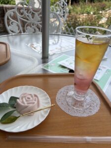 5月の初旬のお誕生日だったので、バラはまだ咲きかけ、1分咲き…と言ったところでしたが、気持ちの良い気候の中、喫茶テラスでバラのケーキとバラの紅茶を召し上がり、リフレッシュできました。